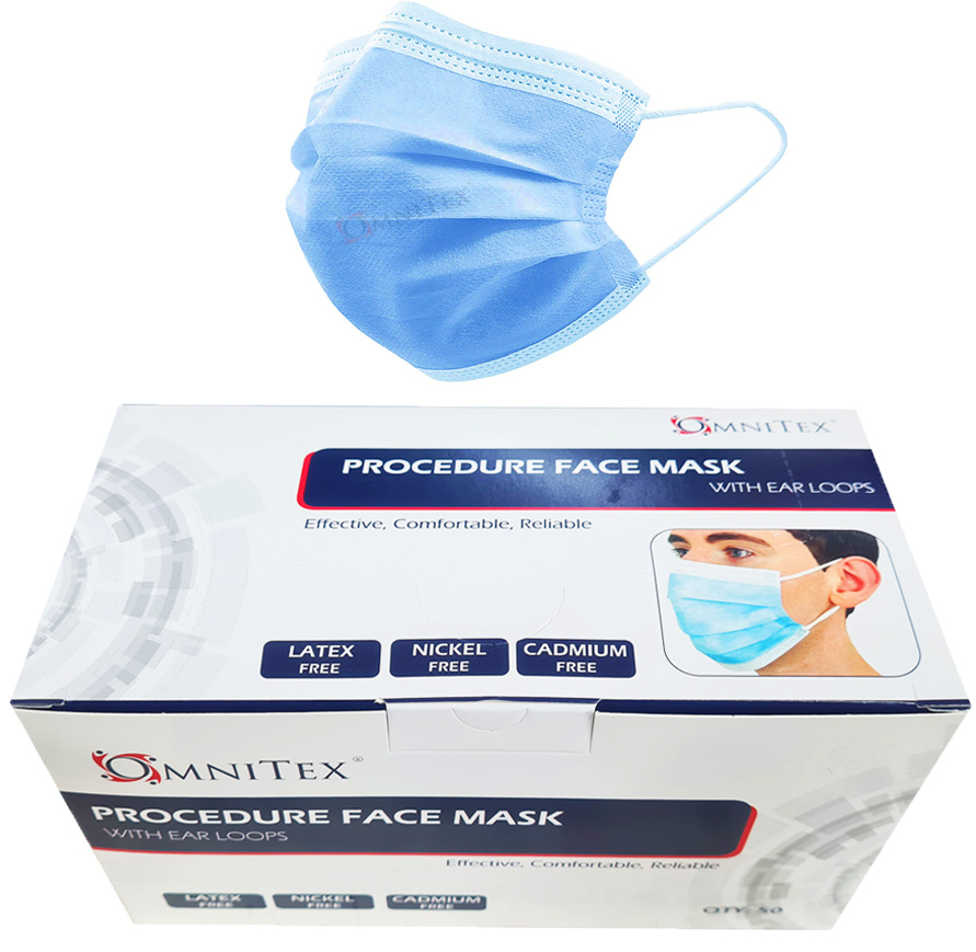 Omnitex premium IIR face masks with ear loops, with meltblown filter - minimum 98% Bacterial filtration and fluid resistant at 120mmhg. EN14683:2019 Compliant.