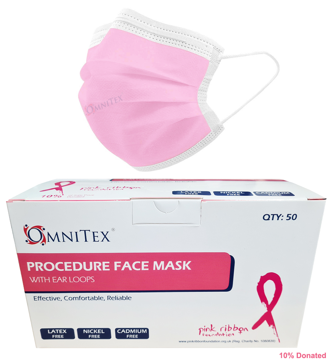 Omnitex premium PINK IIR face masks with ear loops, with meltblown filter - minimum 98% Bacterial filtration and fluid resistant at 120mmhg. EN14683:2019 Compliant.