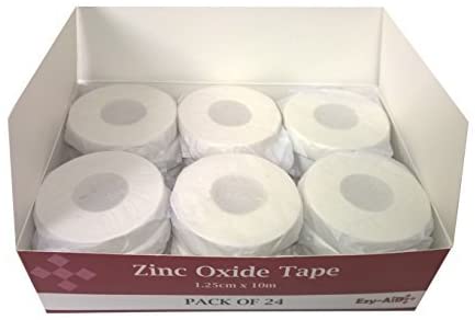 Ezy-Aid Premium Zinc Oxide Tape Manufactured with High Quality Materials to provide with a fantastic Combination of Extreme Strength yet Easy to Tear Latex Free. Ideal for use in Sporting Activities or to Secure Dressings / Medical Applications Box Pack of 24 -- Size: 1.25cm x 10Meters each roll Super Saver Bulk Pack