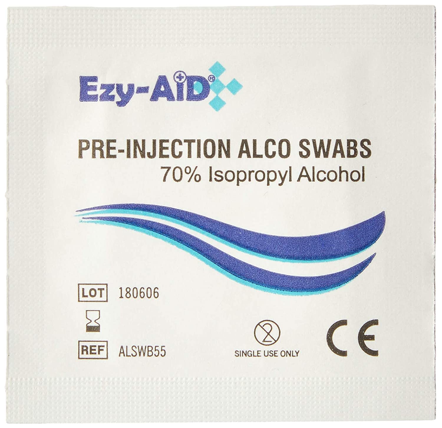 Ezy-Aid 100 Pre Injection Alcohol Skin Cleansing wipes Swabs, 70% Alcohol wipes Brand Name - Ezy-Aid Ean - 5060383113822 Included Components - Swab Item Weight - 40.8 grams Number of Items - 100 Part Number - BTR121014-5