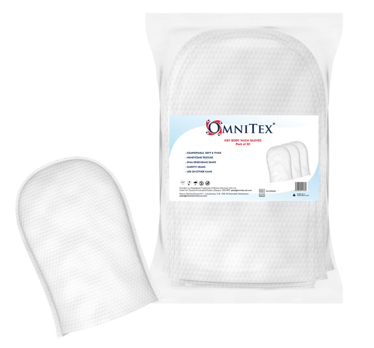 Omnitex dry body wash gloves are soft, thick and ergonomically designed curved gloves to be used either with a body cleansing liquid or on its own in the shower to assist in gentle exfoliation.