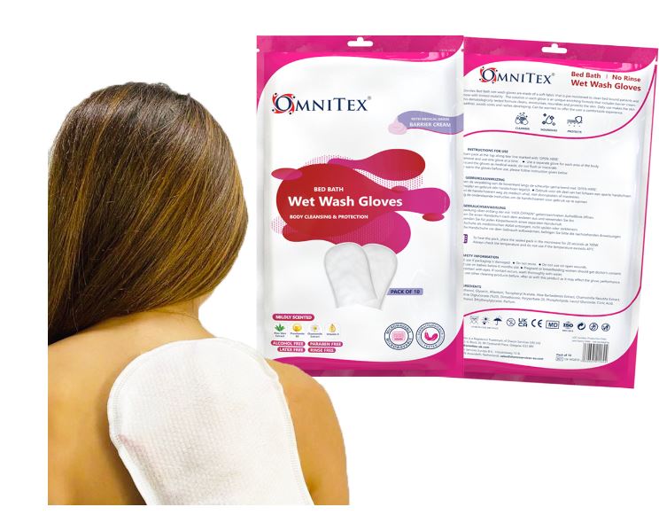 Omnitex Premium Wet Wash Gloves, impregnated with Medical Grade Barrier Cream. Rinse free body cleansing and protection. The unique enriching formula is dermatologically tested and has cleansing, moisturising, nourishing and protecting properties. Innovative alternative to Bed Bath wipes.